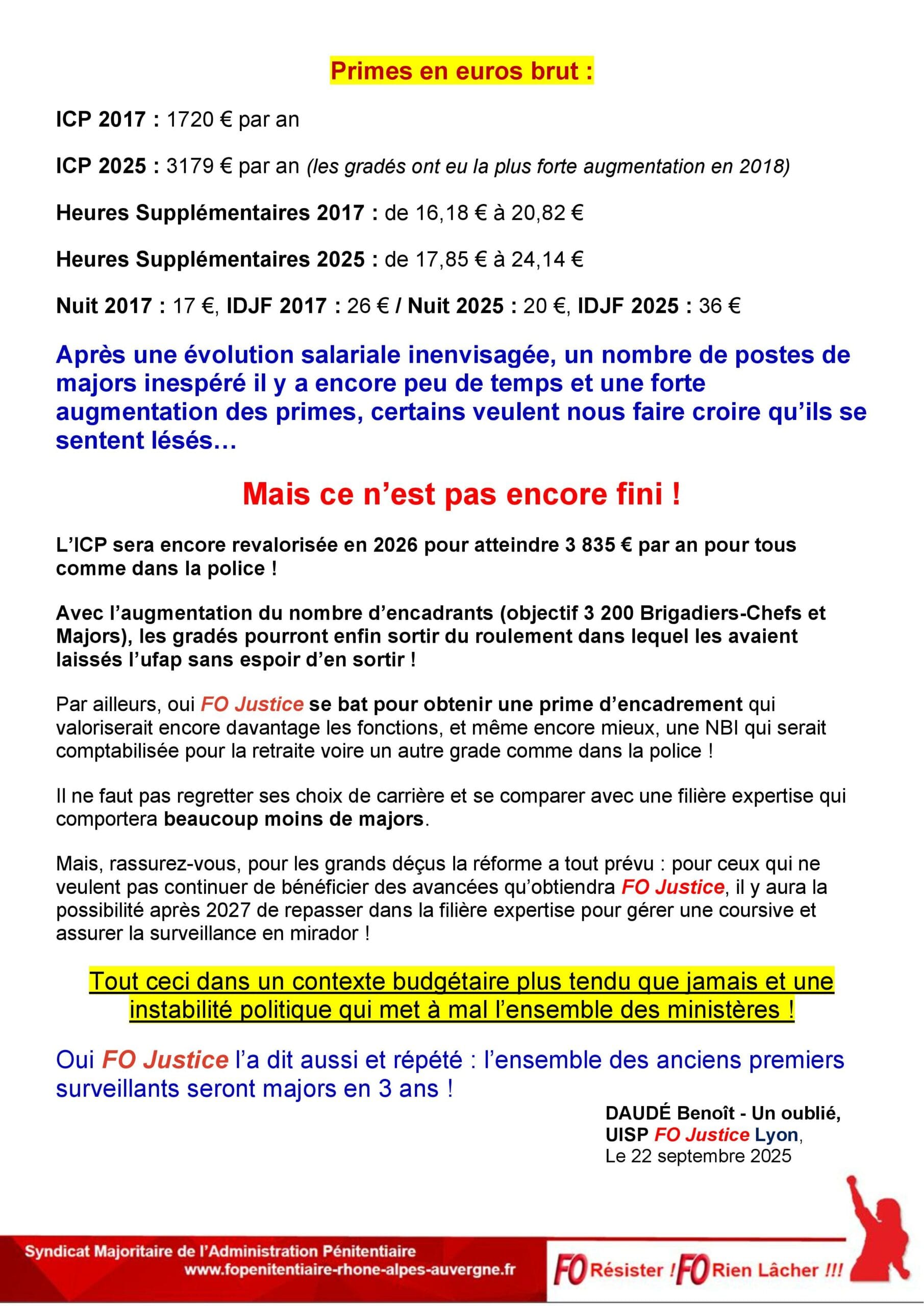 Par ailleurs, ouiFO Justice se bat pour obtenir une prime d’encadrement qui valoriserait encore davantage les fonctions, et même encore mieux, une NBI qui serait comptabilisée pour la retraite voire un autre grade comme dans la police !