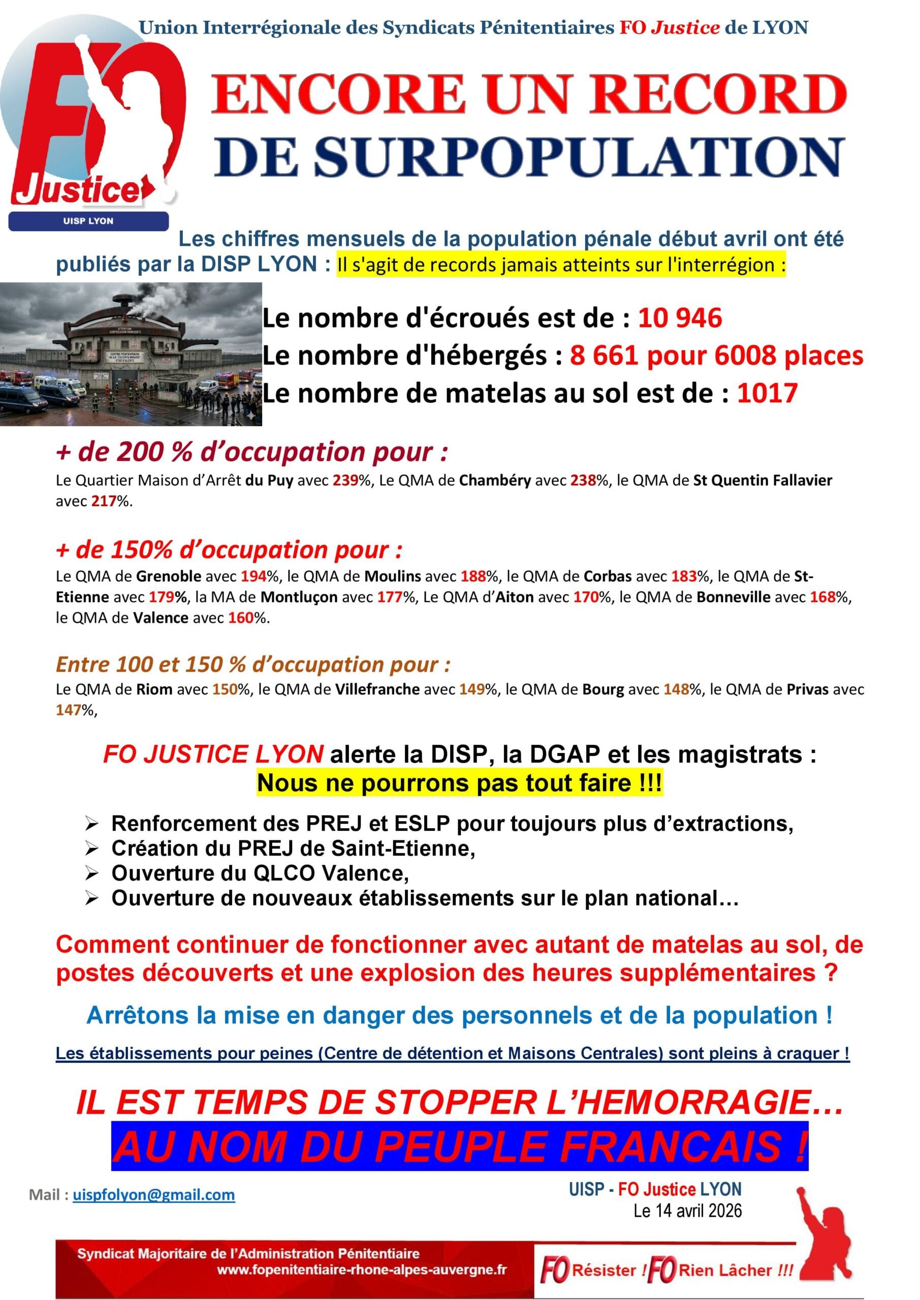 Les chiffres mensuels de la population pénale début avril ont été publiés par la DISP LYON : Il s’agit de records jamais atteints sur l’interrégion :