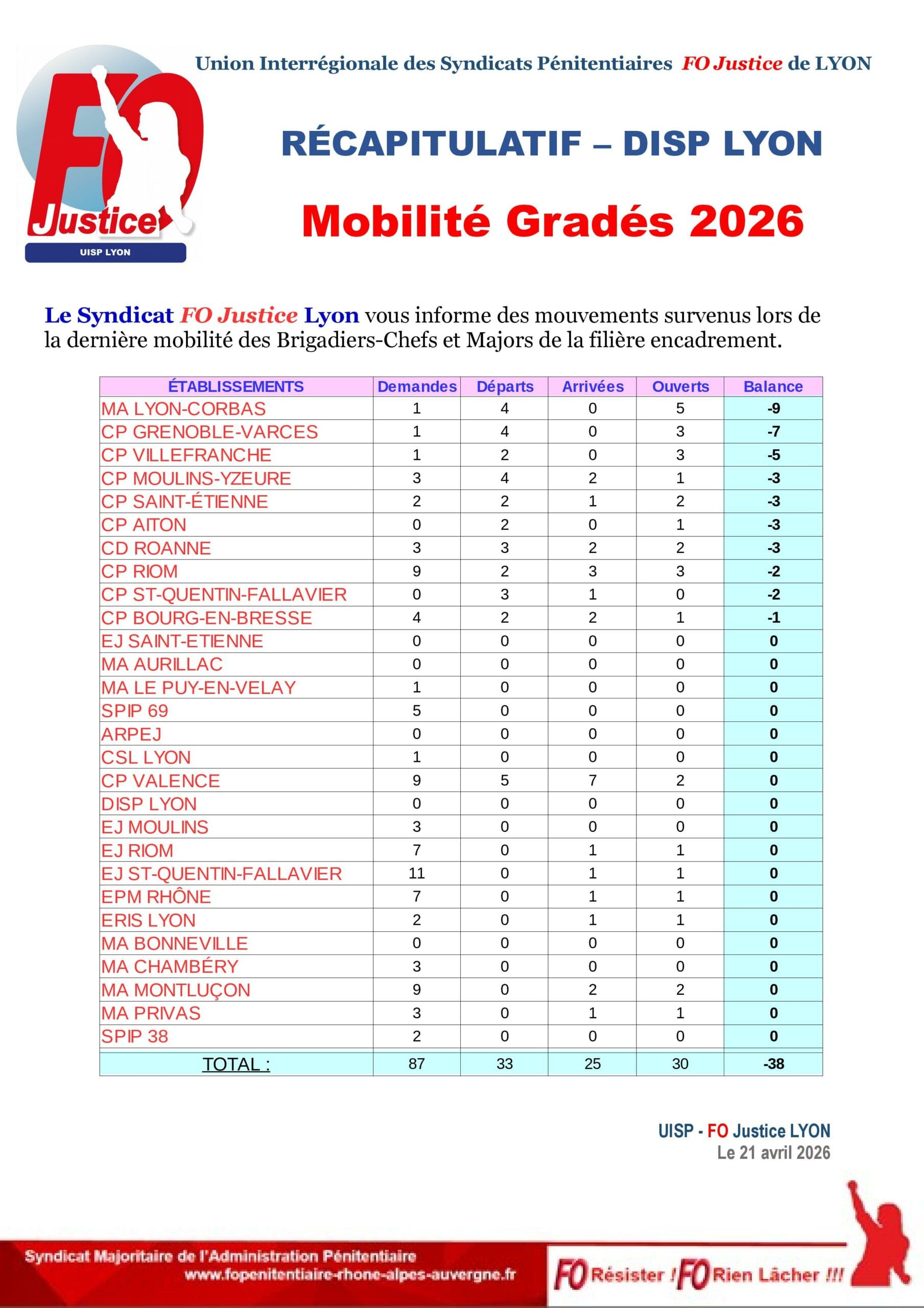 Le Syndicat FO Justice Lyon vous informe des mouvements survenus lors de la dernière mobilité des Brigadiers-Chefs et Majors de la filière encadrement.